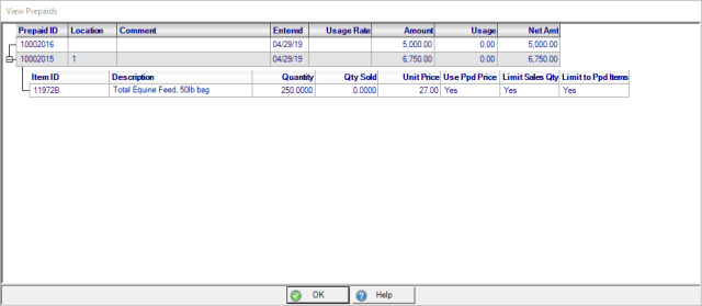 In View Prepaids, the Prepaids are listed with additional information available by expanding the plus sign to the left of the Prepaid ID.