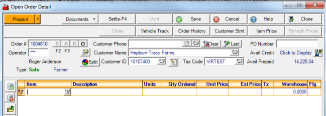 Customers can settle orders and batches with Open Prepaids that load automatically when the customer account is selected. The Prepaid button becomes available in the upper left-hand corner of the window.