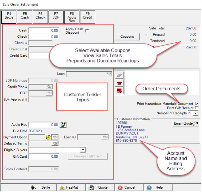 Select the Settle button or the F4 function key to enter payment information when all Items and Services have been totaled on an order. All settlement methods available to the customer will be active. Enter any additional coupons and payment information using one or multiple payment methods until the Sales Total is satisfied. Finalize the order and payment by selecting the F4 function key or the Settle button at the bottom of the window.