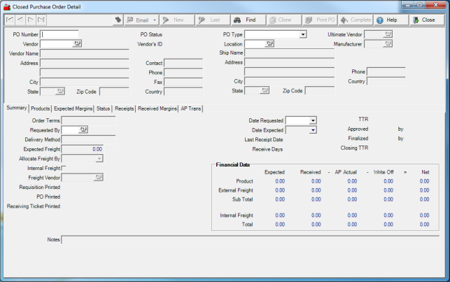 Use to access the Purchase Order Filter to search for Closed Purchase Orders or perform an active field search, enter information in any field with a white background.