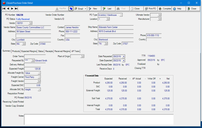 Use to finalize the Purchase Order. Be aware that using this option prior to all AP Invoices being entered removes the PO from the list in PO Applications found in Merchant Ag FIN > AP > Enter Unpaid.