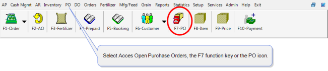 Access Open Purchase Orders from either the PO menu, the PO icon or the F7 function key to add, edit, cancel or receive items on approved Purchase Orders.
