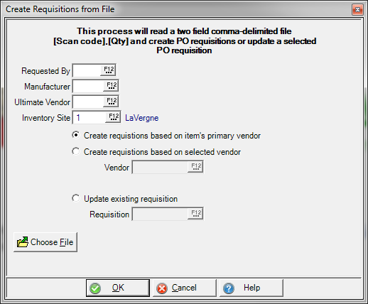 Select Create Requisitions from File to create Purchase Orders from a two field.csv, comma delimited file. The file must contain the UPC Scan Code and quantity to be ordered and can contain items from different primary vendors. Once the file is processed, Purchase Orders with a PO Status of Requisition will be created.