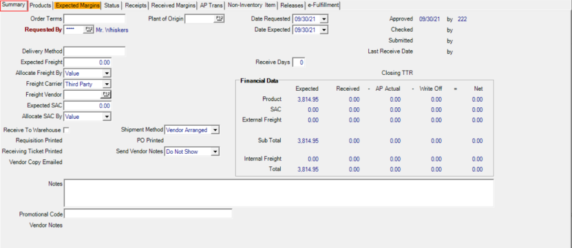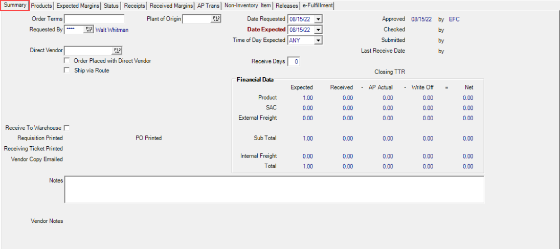 Use the Summary tab to specify information regarding freight, expected delivery dates and track the Financial data of the Electronic Purchase Order. The fields available on this tab will vary based on the PO Type selected.