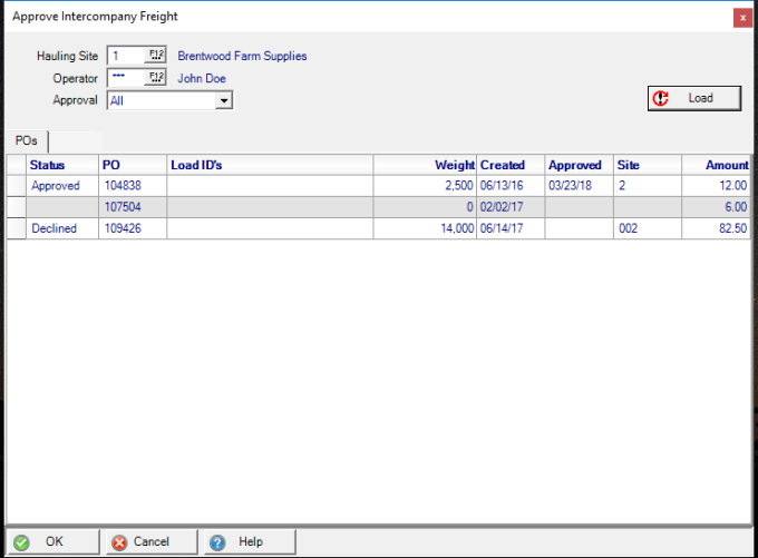 Supply the Hauling Site ID or select F12 to search. Enter the Operator ID of who is approving the Intercompany Freight and use the Approval menu to focus on the Freight approval status. Select either