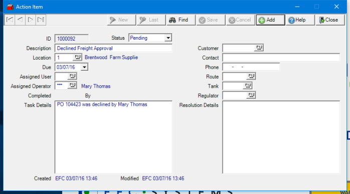 Available if enabled by navigating to Merchant Ag FIN and selecting Create Action for Declined Freight Approvals found in Admin > Installation > Access Parameters > PO tab. |