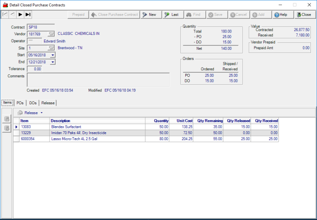 Review the Items for the Purchase Contact on the Items tab that includes Quantity, Unit Cost, Quantity Remaining, Quantity Released, and Quantity Received.