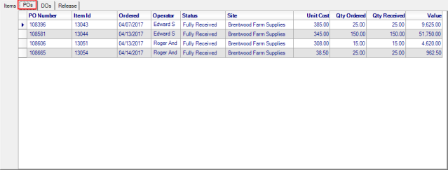 Review the Purchase Orders created using the Release process in this view only grid. All fields can be edited on the Purchase Order prior to submitting to the Vendor.