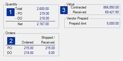 The Quantity section displays the Total quantity of all Items on the Purchase Contract. The Quantity indicated in PO is the quantity Ordered and in DO, the quantity released to a Direct Order.