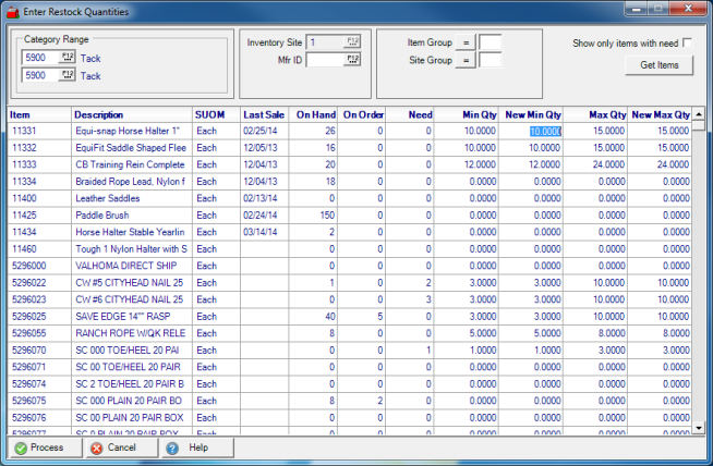 Select Process to copy any quantities found in the New Min Qty and New Max Qty columns to Item detail > Sites > Restock/Reorder.