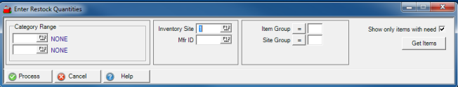 To retrieve and edit Items with existing minimum and maximum stock levels set, select the Show only Items with need checkbox.
