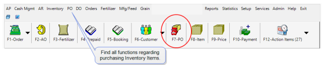 Find all Purchase Order functions by selecting the PO menu. Focus on just open Purchase Orders by selecting the PO icon or use the F7 function key. Select the menu title to learn more about each option available.