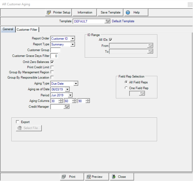 Enter the number of grace days in the Customer Grace Days Filter. The number of days entered will be subtracted from the Aging Date and will filter out any transactions that do not meet this new date.