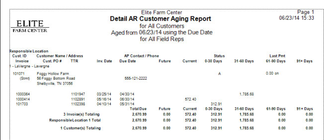 All fields that appear on the AR Customer Aging Summary report are included on the AR Customer Aging Report. Additional information appears on a Detail report.
