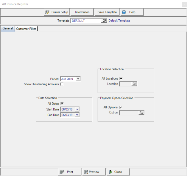 Create a listing of Account Receivable Invoices by Financial Period, a specific date or date range and Location.