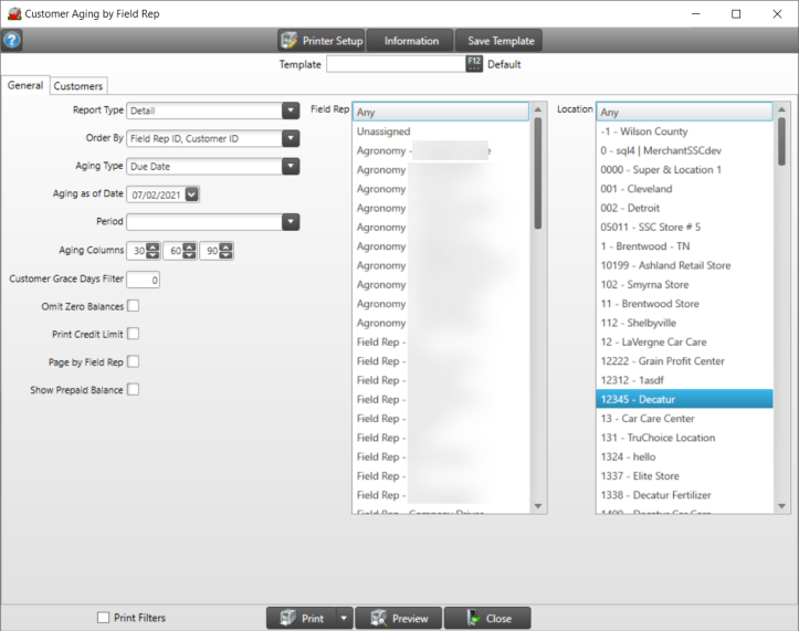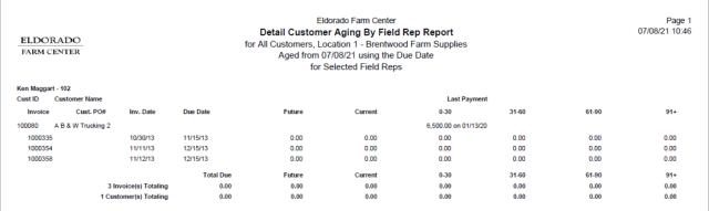 Create a Summary or Detail Customer Aging by Field Rep report to view customer accounts with current and overdue balances for transactions that have a Field Rep assigned. Select a Summary report to view an account list with balance information. Select a Detail report to view each invoice that comprises the balance plus contact information for the account. The report total provides the total outstanding accounts receivable and totals each aging category.