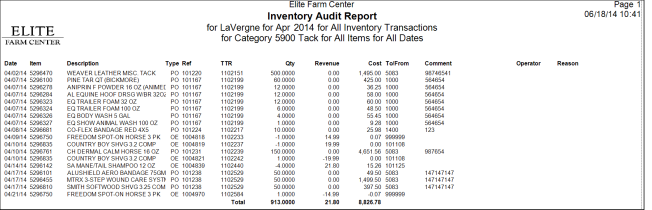 Create an Inventory Audit report to examine transactions affecting inventory. Tailor your report to a specific item or item category, financial period or date range, or transaction type for detailed information. This report includes information on Quantity affected, revenue generated and cost associated with Inventory transactions.