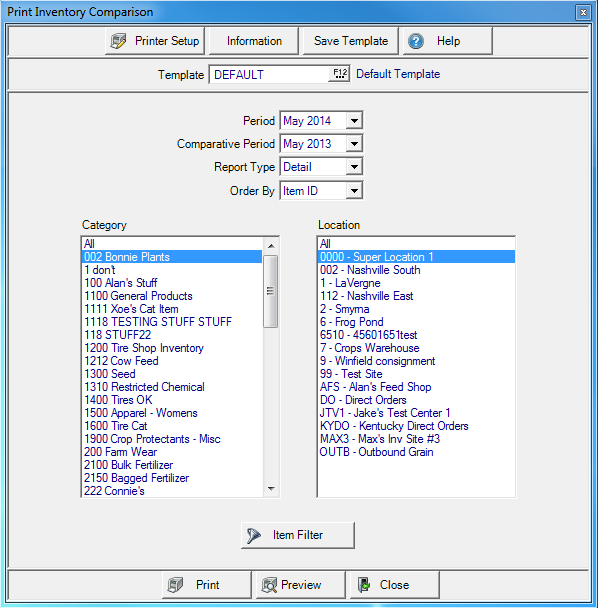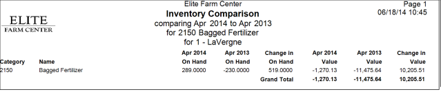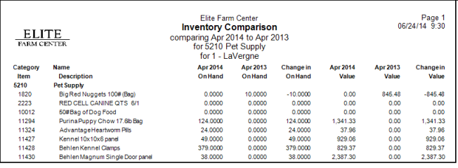 Compare Inventory On Hand Quantities and Value for two Financial Periods. Select a Summary report for Item Category totals or Detail for Item Category and Report totals.