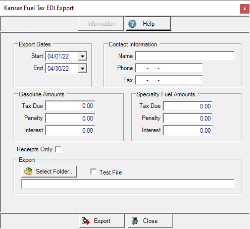 Use the export for gasoline, propane and distillate fuel sales and purchases for export to the Kansas Department of Revenue. The Motor Fuel License of up to 20 alpha-numeric characters set in Setup > Access States is referenced and should be verified or added prior to the first export.
