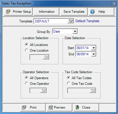 Tax Code Selection indicates all Tax Codes selected by default. Select One Tax Code and enter the Tax Code ID or select F12 to search.