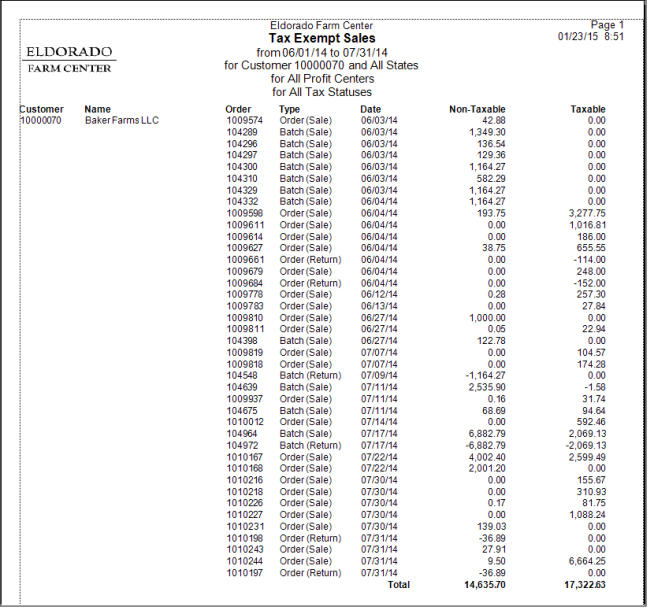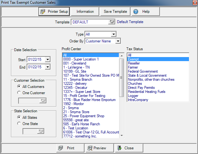 Use the Tax Exempt Customer Sales report to list sales for tax exempt customers. Customize the report by selecting the type of transaction reported on, a specific date or customer or create a report for just one State.