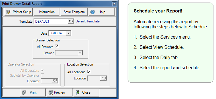 Drawer ID and name displays. The Drawer ID appears in the report title when running the report for one drawer.
