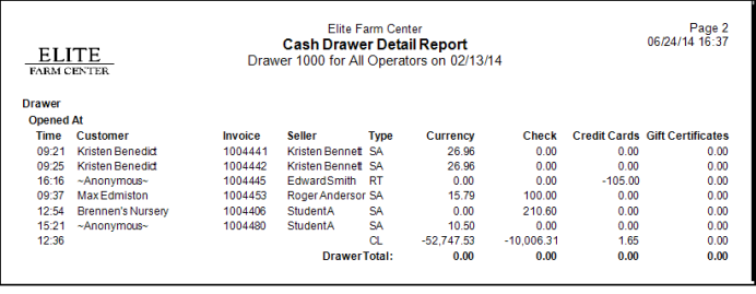 Drawer Totals totals of the Currency, Check, Credit Cards and Gift Certificates columns.