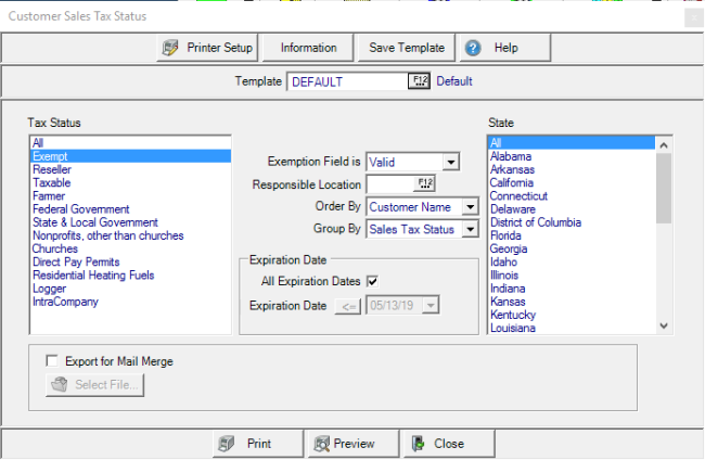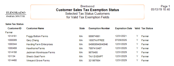 List customers based on Sales Tax Exemption Status (Exempt, Farmer, Reseller, Taxable) and Valid/Invalid Exemption Fields.