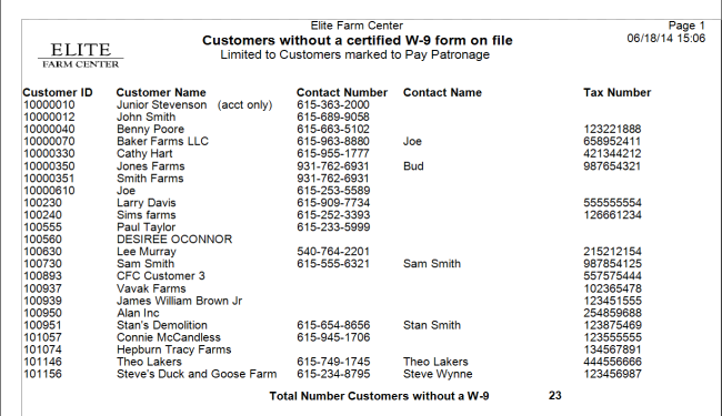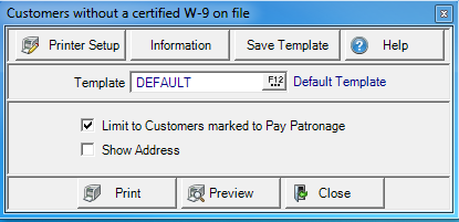 View and contact customers without a certified W-9 form on file, set on the Credit Tab of the Customer Detail. This is used prior to completing 1099’s for year end and assigning patronage.