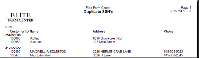 Lists customers that may be listed multiple times under the same Social Security Number or Federal Employer ID Number.