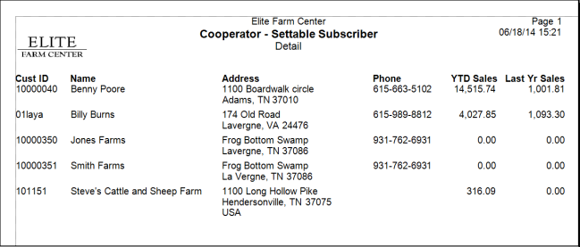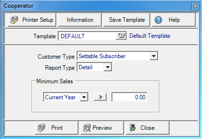 This report allows the user to use criteria regarding YTD sales for either the current or prior year along with their Customer Type to report on the Customer settings for the Company’s magazine. Lists customers in summary or detail that are set up to receive Cooperator.