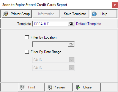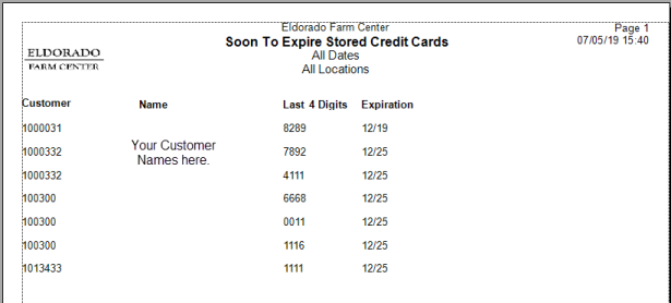 Locations utilizing stored credit cards to pre-authorize transactions can use this report to track expiration dates of the cards.
