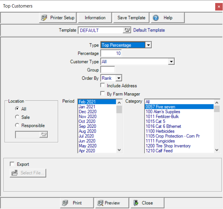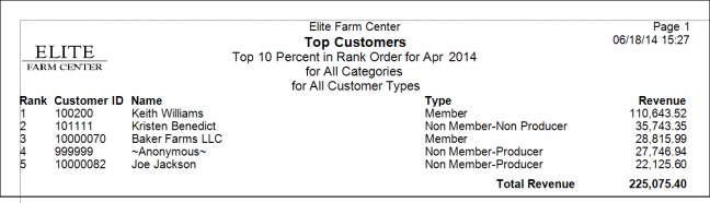 Create a report that lists the top revenue generating customers by top percentage or revenue or top quantity of sales. This report can be customized to include customer contact information as well as focus on top customers by one or multiple item categories.