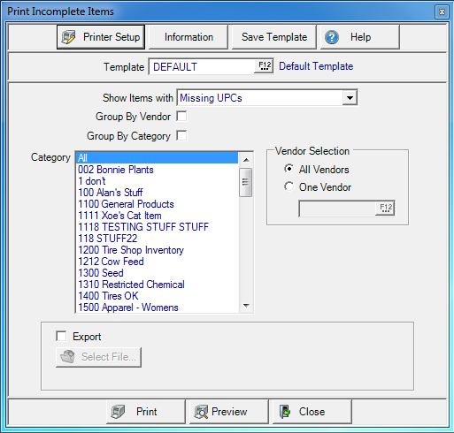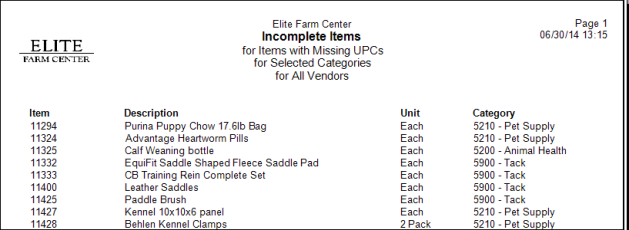 - Either Missing- Will include items missing a UPC or has Zero Weight. This report prints in numerical order by Item ID and does not indicate what is missing from the item.