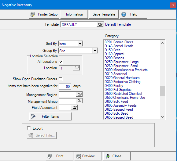 Limit the item on the report by entering a number for Items that have negative for "X" days. Leave blank to include all negative items.