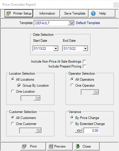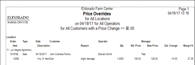 Create a list by specific day or by a date range of Item Price Overrides and the Operators entering them. This report includes the standard price of the item and the price the item was changed to along with the Reason. If this report is scheduled, the current date is used.