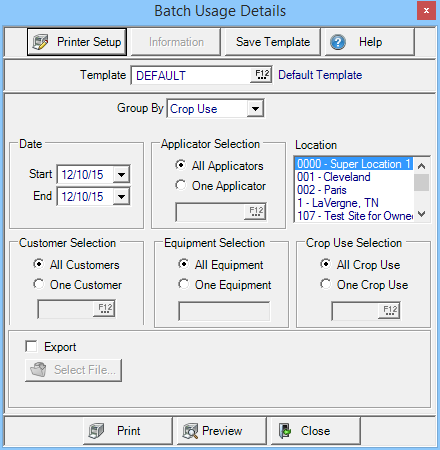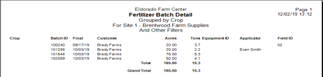 Create a Batch Details report to view information on Fertilizer Batches by Date, Applicator, Location or Customer.