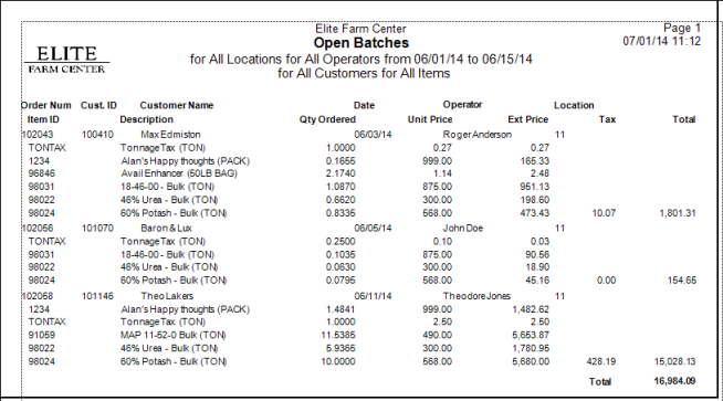 Create a list of all Open Fertilizer Batches by Date, Location or Customer. This report also totals the value of all Open Batches.
