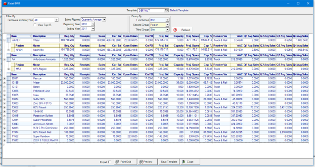 - Region grouping indicates the sum value of the NH3 Nurse Tank field for all item sites associated with the Region indicated