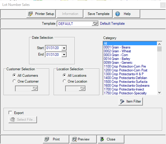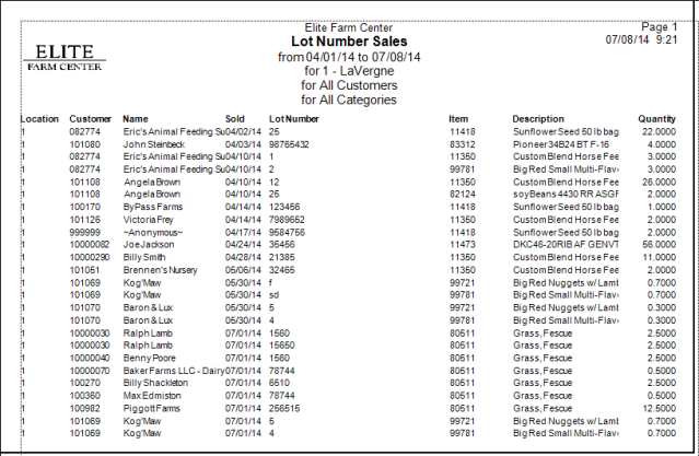 Create a report to list all orders of Items flagged for Sales or Full Lot tracking for a specific date range. Customize the report by selecting a specific Customer, Location or Item.
