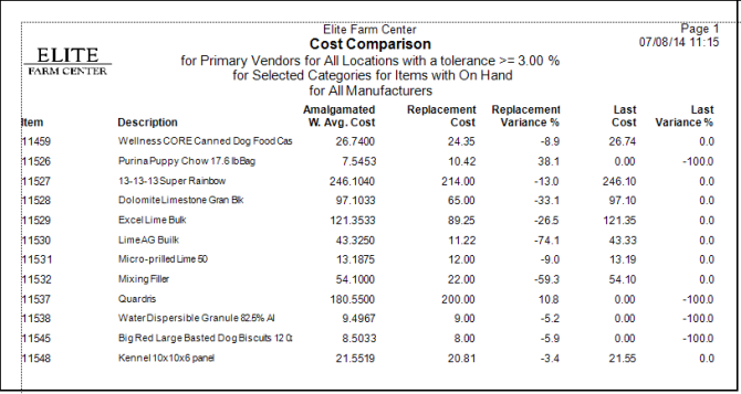 Compares Amalgamated Weighted Average Cost, Replacement Cost, and Last Cost of Items.