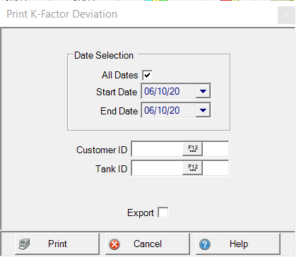 Reporting on a specific Customer or Tank is possible by entering a Customer ID or Tank ID or using F12 to search.