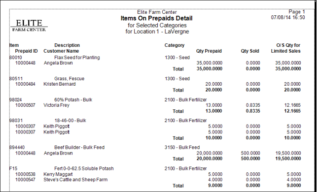 Total row displays the Customer Totals for Qty Prepaid, Qty Sold and O/S Quantity for Limited Sales.
