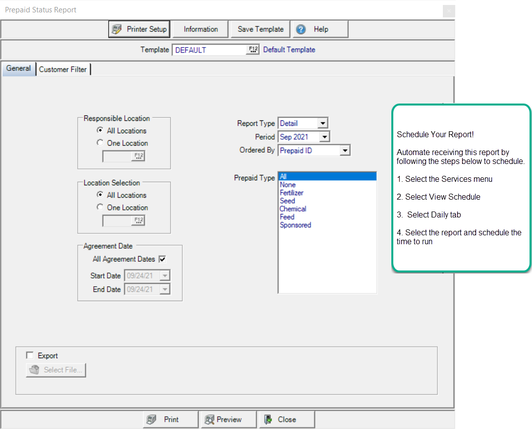 Prepaid Type defaults to All for the report or one or multiple Prepaid Types can be selected.