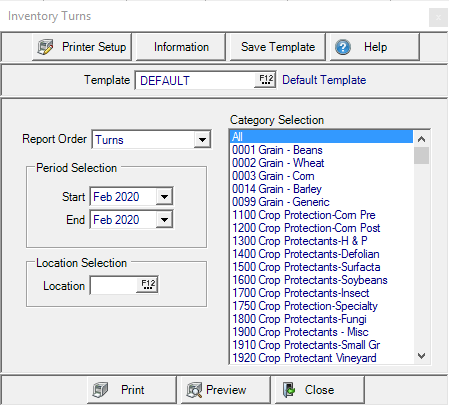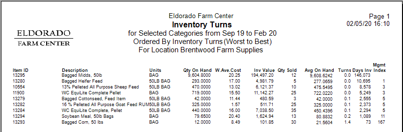 Use an Inventory Turns report to determine the sales velocity of items for a selected date range. Customize the report by selecting a specific Location or Item Category.
