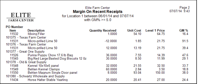 Lists recent receipts by PO Number showing Quantity Received, Unit Cost, Unit Price and Gross Margin % for each item.