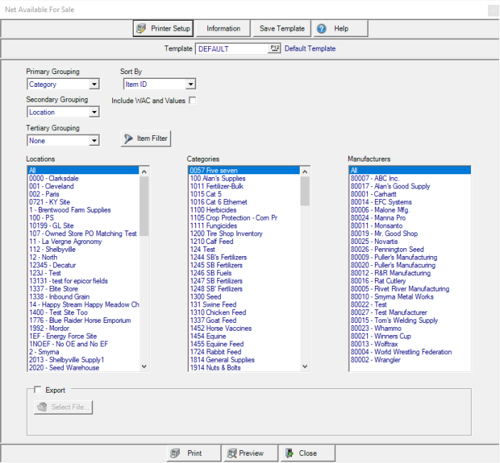 Primary Grouping choose from Company, Location, Manufacturer