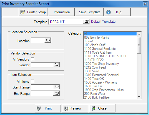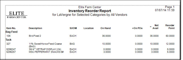 Create a List report for Items that have fallen below the Reorder level set on the Sites tab in Item detail. Customize this report by Location, Vendor, Item or Item Category to base new Purchase Orders.