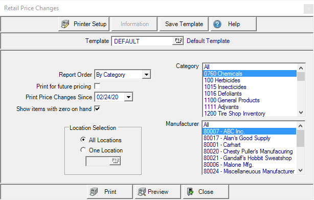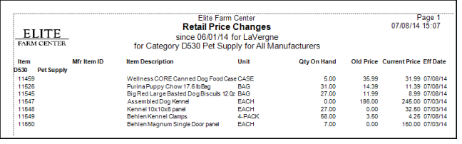 Create a Retail Price Changes report to review when L1 Current Prices changed or select to view any Future Pricing set on Items. Customize this report by selecting specific Item Categories or Manufacturers.