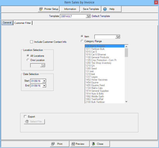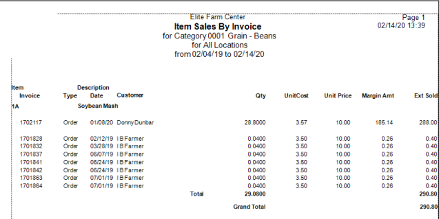 Create an Item Sales by Invoice report to group item sales by Item ID with each invoice listed. The report includes the transaction type, Customer name and quantity sold. Customize this report to select one Customer, Item or specific day or date range.